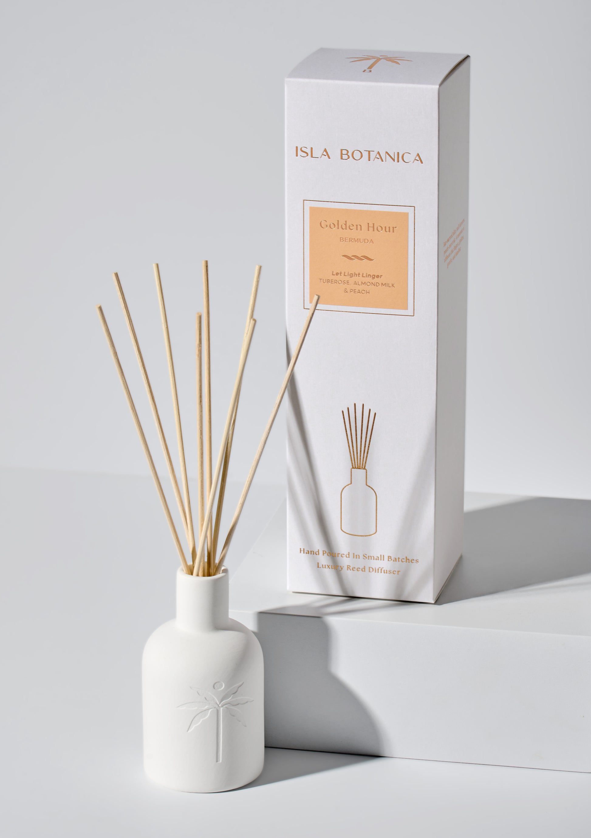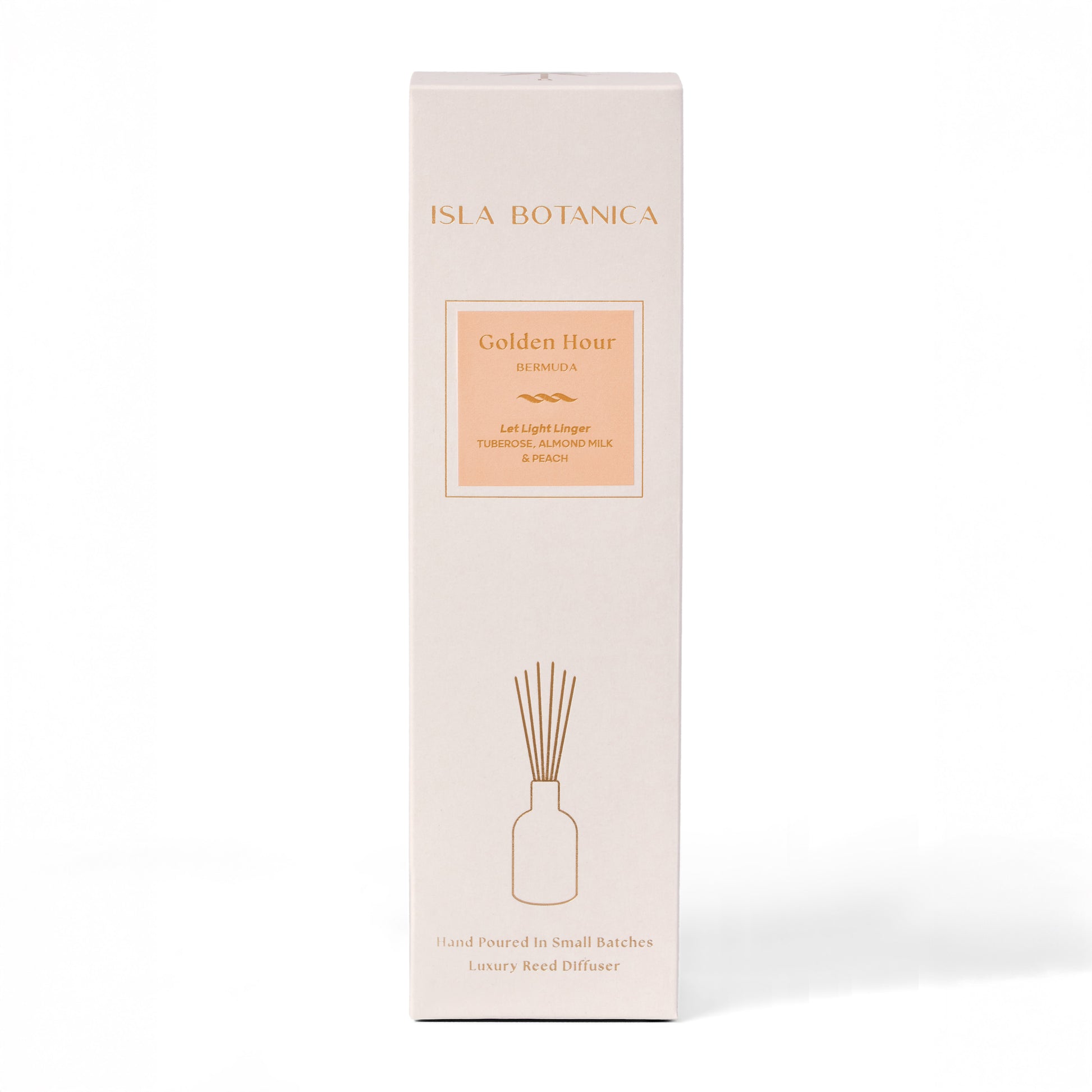 Crafted as a luxury reed diffuser, Golden Hour is designed to bring a light, floral elegance into your space every day. Its natural, non-toxic formulation slowly diffuses through the reeds, enveloping rooms with the feeling of paradise — warm, cocooning, and endlessly inviting.