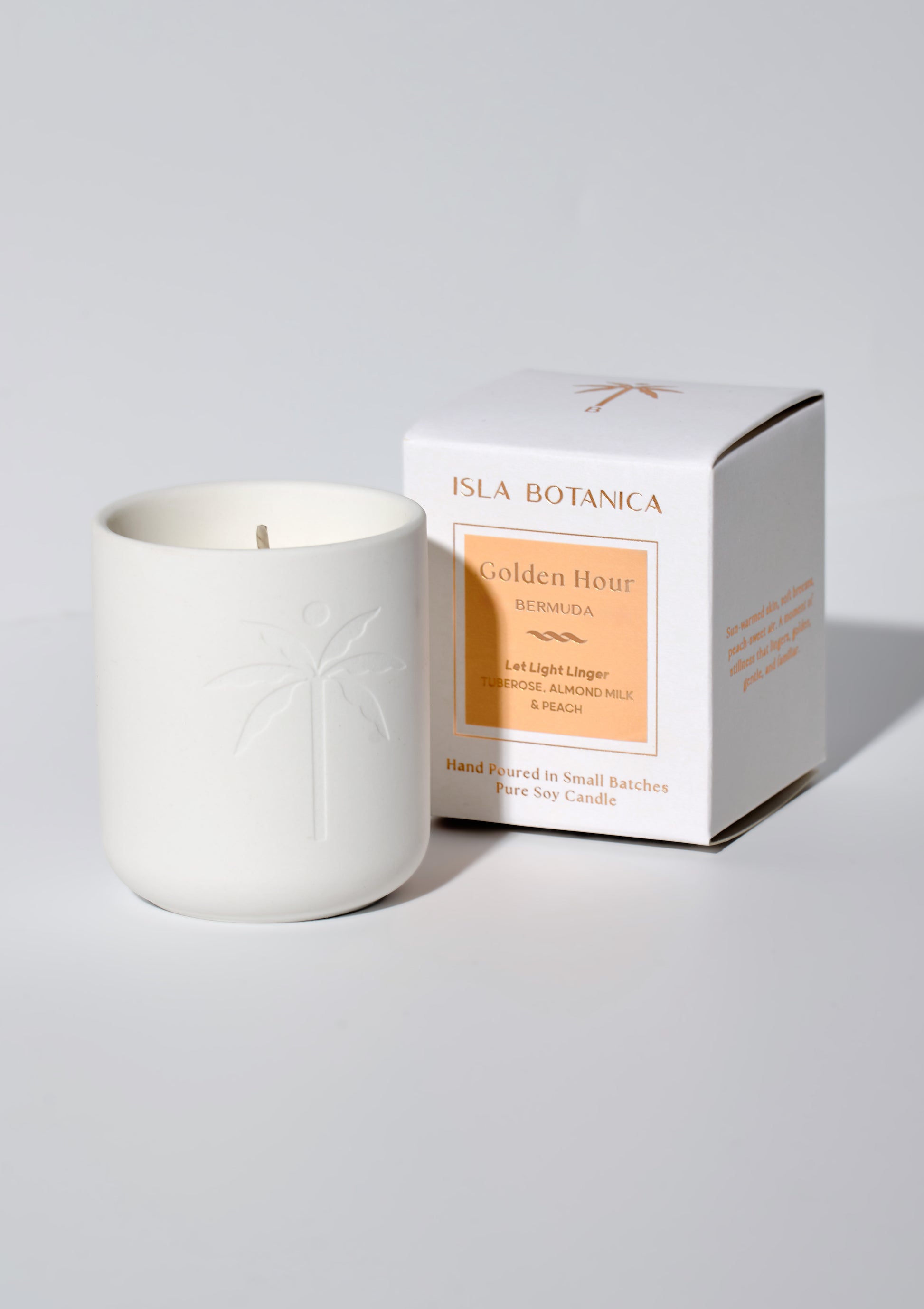 When the world softens and the light turns warm, everything feels at ease. Golden Hour captures this fleeting glow with creamy tuberose, ripe peach, and velvety almond milk, deepened by patchouli and a touch of black pepper. Sunlit and soothing, it wraps you in the quiet comfort of tropical living.